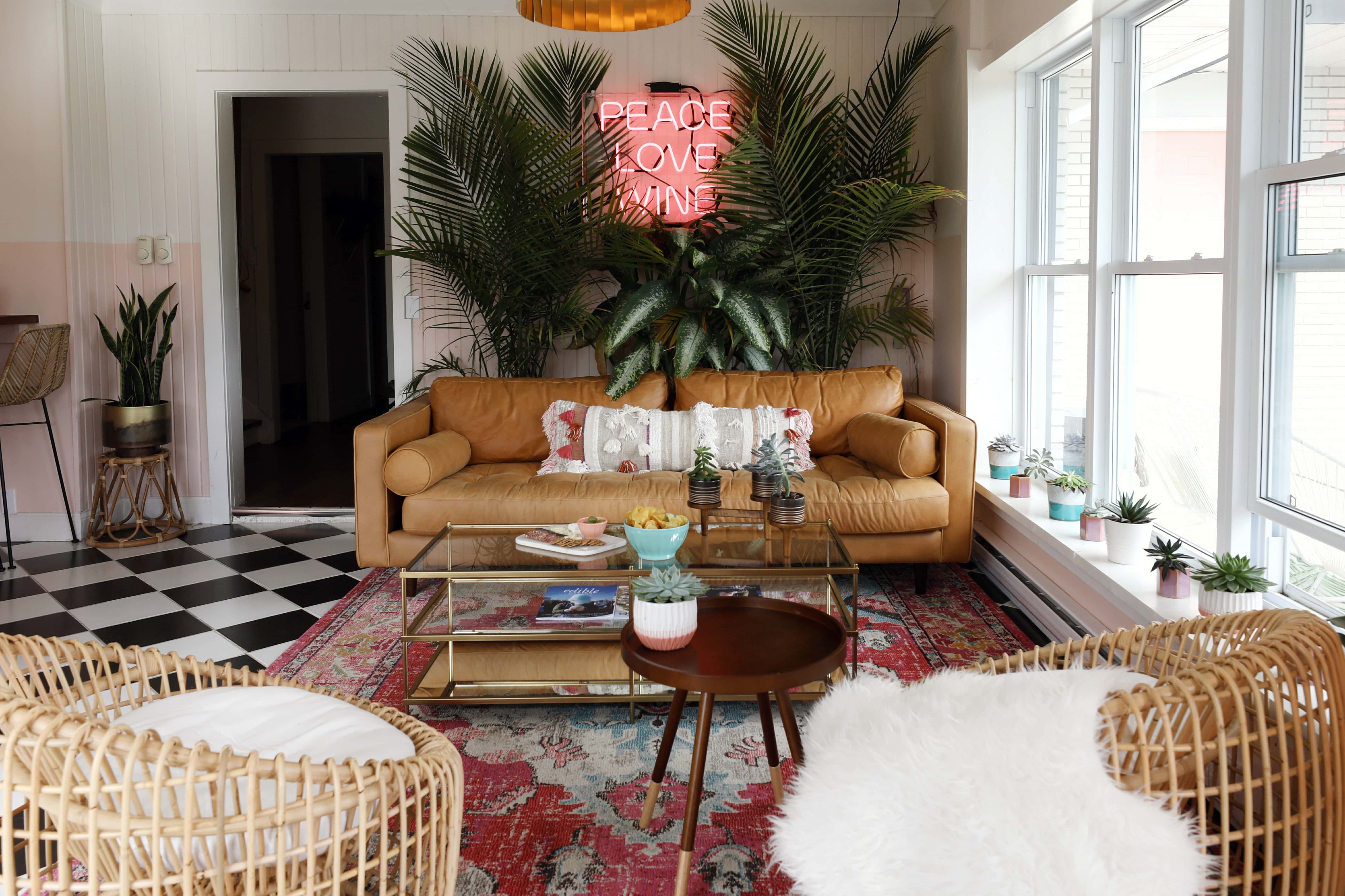 Splashes of pink, greenery, succulents, copper fixtures, a rich leather couch, checkerboard tiles and a neon pink sign that reads “PEACE LOVE WINE” round out the space. A perfect mantra especially given that each guest is greeted with a complimentary glass of rosé upon arrival.